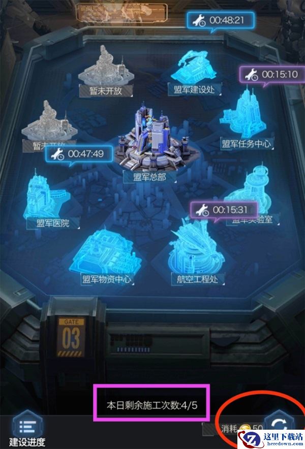 四、施工任务的完成需要派遣队列到对应建筑,完成施工后队列将自动返回。指挥官可以在期间随时召回队列,但将失去已有的任务进度。因为每日施工次数是在完成施工时才会扣除,所以中途召回是不会消耗次数的。