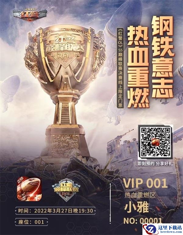 约直播,拿福利,多重好礼等着你!各位指挥官现在前往S5决赛直播页面预约直播,支持自己心中的最强战队,可获得精彩豪礼、抽取实物大奖的同时,还有机会获得超燃直播定制门票!硬核武器、高等机甲、巅峰奖杯,融合了红警经典元素与S5赛季最高荣誉象征的这张定制门票,将会镌刻上指挥官的ID、区服、独一无二的编号,共同铭记红警与指挥官相互陪伴的燃情岁月!拥有即可原地升级"VIP",观看直播享神秘特权!精彩不容错过,快快扫扫描下方二维码或前往“红警OL手游”公众号,点击菜单栏-官方社区-S5总决赛,进行报名与抽奖吧~