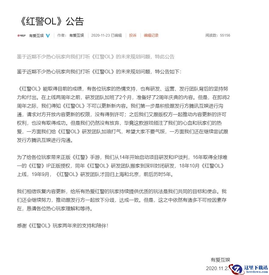 2020年11月23日,有爱互娱官方微博针对《红警OL》两周年庆典活动未如期更新等问题发布公告:“研发团队为准备两周年庆典内容加班2个月,但后期被腾讯互娱方面告知《红警 OL》不可以更新新内容。我们第一步是积极跟发行方腾讯互娱进行沟通,请求对方开放内容更新的权限,没有得到许可;之后我们又跟版权方一起推动内容更新的许可权利,也没有取得成功。”