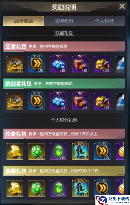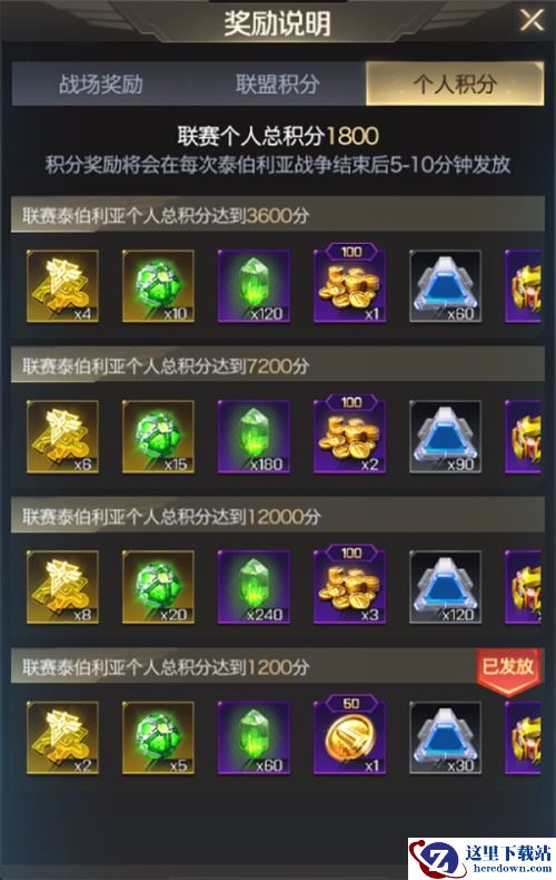 愈战愈勇,参战有奖!除了冠军宝座的激烈争夺之外,参赛联盟还可通过比赛获得丰厚奖励!本赛季所有泰伯利亚比赛的联盟和个人积分,都将进行累计。当联盟积分和个人积分累积到相应数值后,联盟和个人即可获得额外奖励!