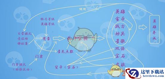 荒野乱斗各类资源转化如图所示,乱斗宝箱位居其中心位置,它可以指向除皮肤外的所有直接资源,(皮肤也可通过开出的宝石来简介获取),而我们通过日常模式、门票模式以及升级英雄荣誉、经验等级,来获取奖章或星光点数,积攒乱斗宝箱。