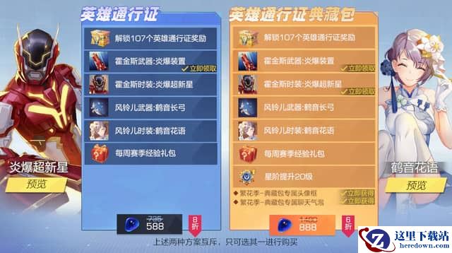 英雄通行证的星阶大奖为风铃儿全特效旗袍时装及武器【鹤音花语】、【鹤音长弓】,冰蓝色的旗袍上远山淡墨几笔,仙鹤腾于花枝之上,衬托出风铃儿美妙的身段。爱她,就为她穿上一袭华美的旗袍吧!