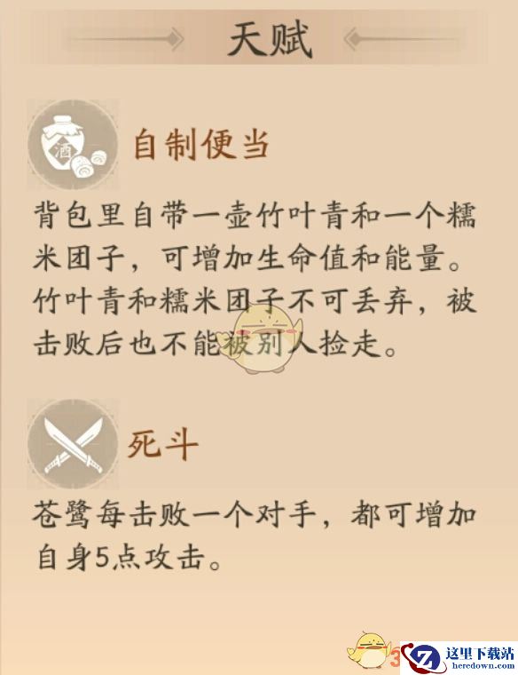 被动自制便当弥补了药品不足的尴尬,尤其是在特别前期特别刚的地方(比如风吟镇)药品虽然加成比较低,但前期用足够了;被动死斗让苍鹭越刚越强,苍鹭不能苟,不然后期遇到其他苍鹭,他们的攻击都会高你许多,你就打不过他们啦!