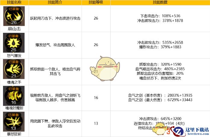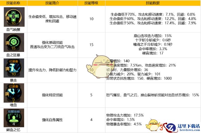 崩山击:可取消攻击后摇,附带出血效果,技能伤害低,加点优先级低;
