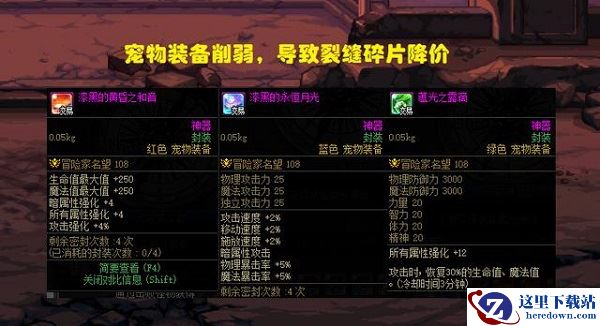 但是,这里有一个很重要的问题,“次元风暴碎片”的价格和宠物装备挂钩,而国服又刚好把宠物装备砍了一遍(红蓝属性减半,绿色移除了自动拾取),所以这样一来的话,宠物装备不值钱了,次元风暴碎片估计也不太值钱。