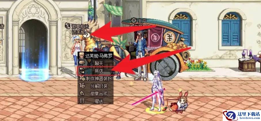 1、首先在游戏中的下图位置找到npc达芙妮,与之对话后点击商店。