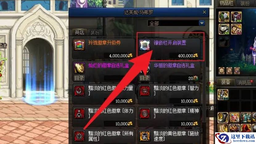 2、在这里有一个镶嵌栏开启装置,需要400000金。