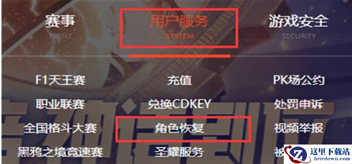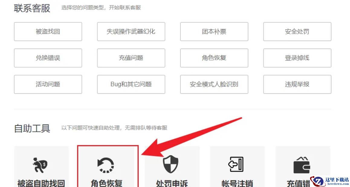 1、登录游戏官网后找到用户服务的角色恢复。