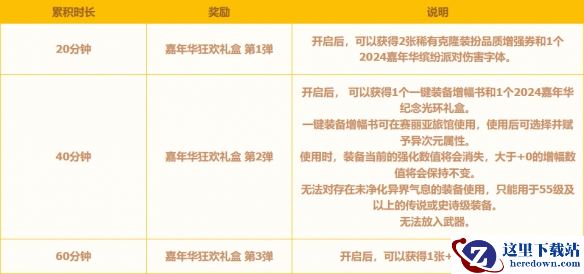在DNF嘉年华期间(2024年11月22日20:00~2024年12月19日维护前),累积在线20分钟、40分钟、60分钟可获得嘉年华在线奖励:一键装备增幅书、2024嘉年华缤纷派对伤害字体、2024嘉年华星耀流彩纪念光环、稀有克隆品质增强券、+13装备强化券。