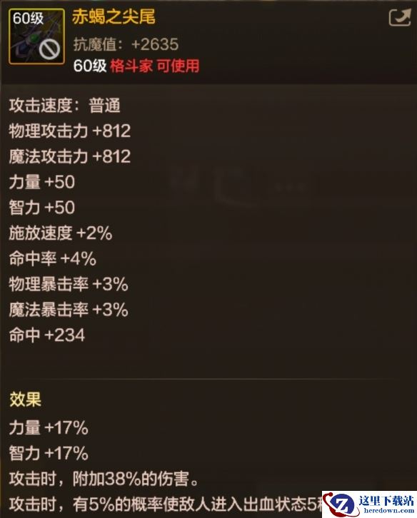 赤蝎之尖尾是《地下城与勇士:起源》中的格斗家职业60级史诗爪,有着攻击时概率触发出血,并附加伤害的效果,接下来就让我们一起了解一下DNF手游赤蝎之尖尾的属性怎么样吧。