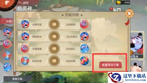 需要注意的是天赋加点每个英雄都需要单独设置,因为每个英雄的天赋都不一样,天赋预设的加点可以保存两套方案,比如坦克英雄可以分别保存一套输出高和另一套比较抗揍的方案,随时进行调整。