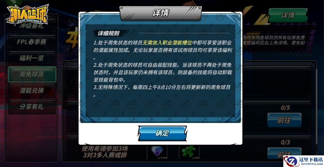 自本周开始,《潮人篮球》每周周四更新后,将替换新的周免球员供所有玩家免费试用,处于周免状态的球员,无需放入职业潜能槽位中即可享受该职业的潜能属性加成。无论玩家是否拥有该试用球员均可享受该福利。