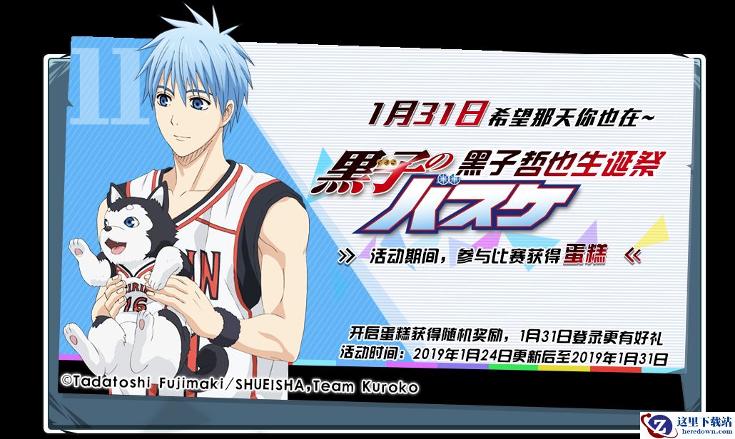 1月24日-1月30日,《潮人篮球》邀您共庆黑子的生日!参与比赛即可获得道具 “生日蛋糕,内有惊喜大奖,最多可获1688钻石!1月31日当天登录即可收到黑子生日礼包。快来《潮人篮球》,和黑子火神一起制霸球场,欢庆诞辰吧!IOS用户可前往App Store搜索“潮人篮球”下载游戏!安卓玩家可前往潮人篮球官网下载!关注《潮人篮球》手游官方微信(chaolan163),get来自水泥球场的一手资讯!