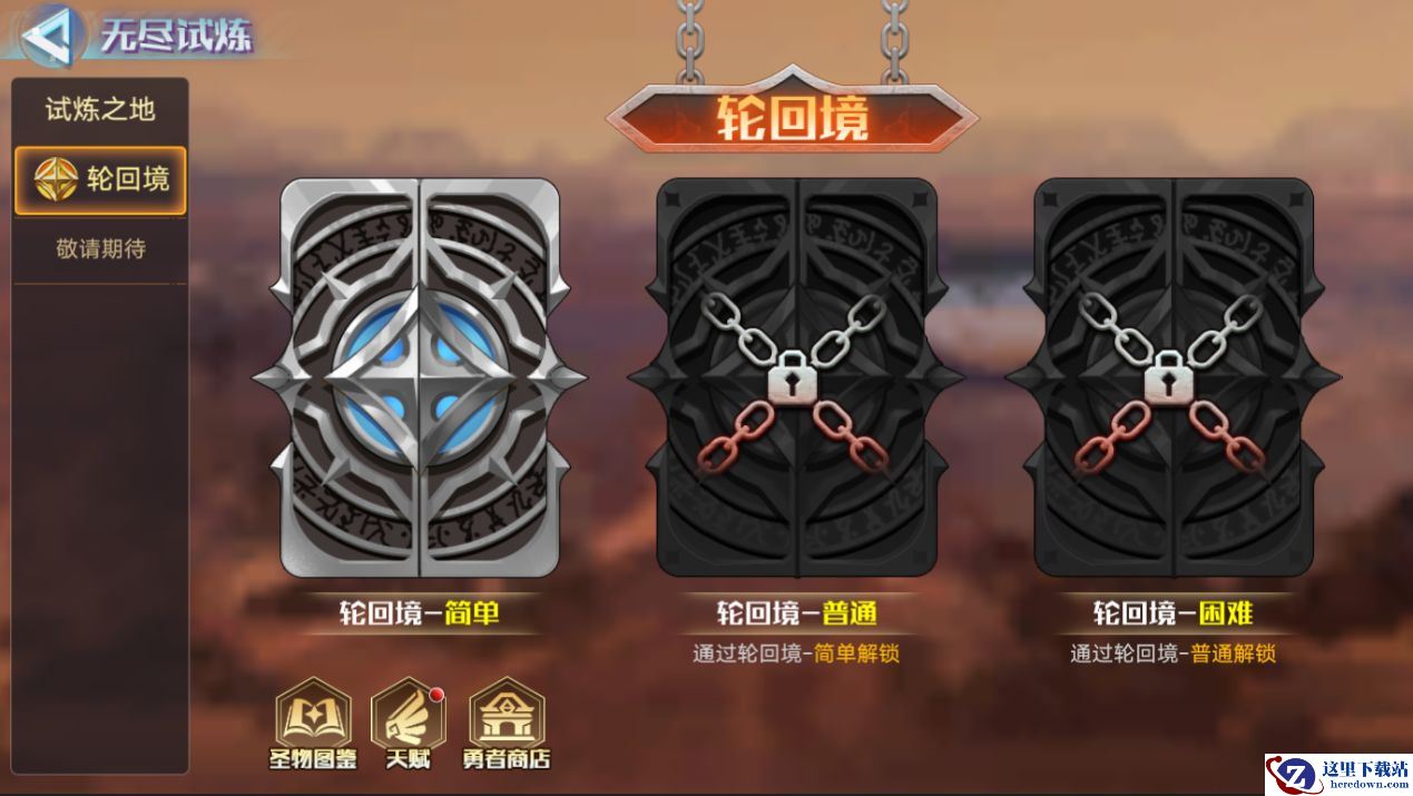 5、轮回境的难度为简单、普通、困难三种,首次通关上一难度即可解锁下一难度,试炼的难度越高,试炼过程中获得的勇者币越多。