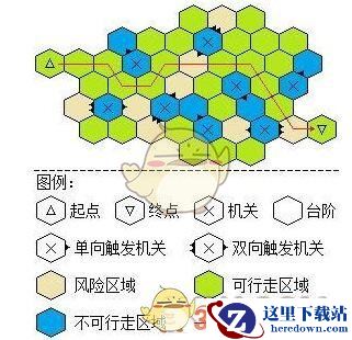 通过关卡2需要走过一个由若干个六边形台阶组成的一个地图,如图,其中有毒蛇机关,毒蛇机关会喷出毒液让我们回到起点。通关的条件是从起点顺利走到终点。