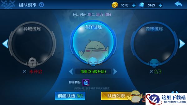 组队副本有6种试炼,对应6个阵营,掉落对应阵营的材料,用于圣器洗练。每日开启两个试炼,一个试炼可挑战3次。失败不计次数,胜利才计。