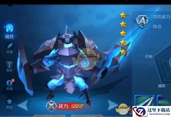 前期能养成伤害最高的A级物理英雄,晋阶后普攻为群体攻击,伤害可观,输出爆表,能量技能为直线物理攻击,击飞效果不明显,只有一瞬间,且施放技能时不能进行普攻,有点尴尬。攻击法抗怪物时候效果较好。必杀技和能量技差不多,只是伤害一高出许多,一般般。