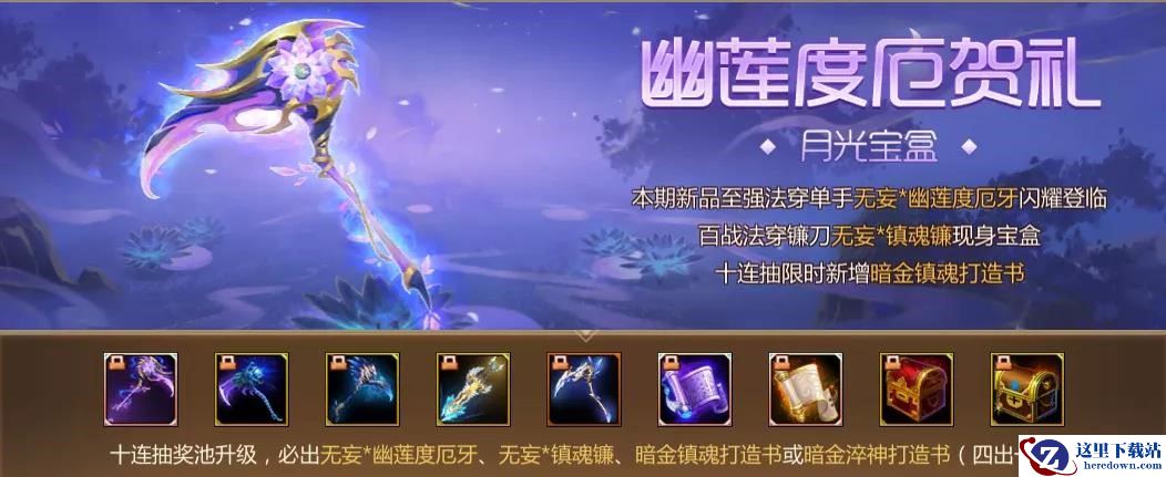 此次“少年风流”新版本十连抽活动月光宝盒-幽莲罗生贺礼上线,投放全新法穿长柄无妄*幽莲罗生杖闪耀登场、 百战法穿长柄无妄*镇魂戟现身宝盒,十连抽限时新增暗金镇魂打造书。