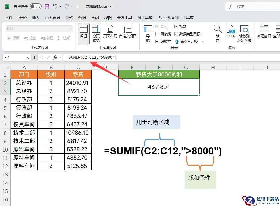 公式:=SUMIF(C2:C12,">8000")