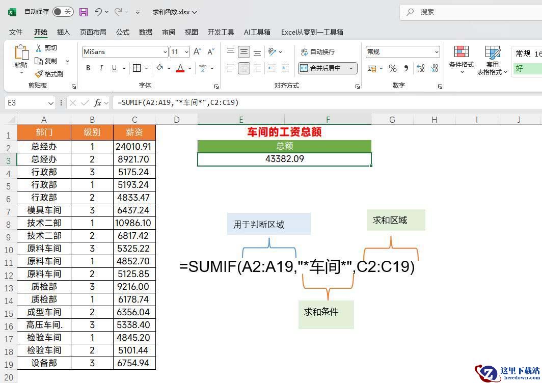 如果你想根据关键来和,我们就需要搭配通配符来使用,一般就是在关键字的前后各连接一个星号,就可以实现根据关键字求和了,如下图,我们是需要统计车间的薪资之和