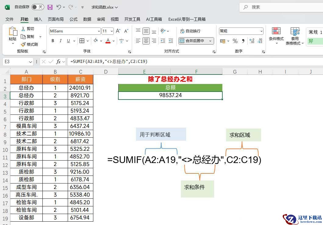 公式:=SUMIF(A2:A19,"<>总经办",C2:C19)