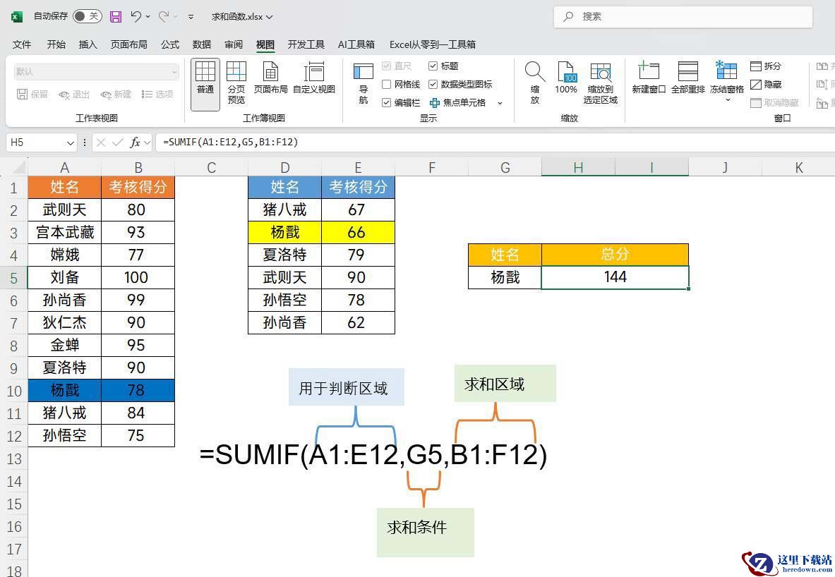公式:=SUMIF(A1:E12,G5,B1:F12)