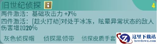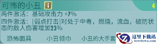 出装套路有2个方向,一是选择各2个不同套装2件套效果提升攻击力的配件,触发2个2件套套装,即可增加14%的攻击力。对套装情有独钟的监督者们可以选择【旧世纪侦探】或【可怖的小丑】配合队内有造负技能英雄使用。
