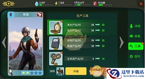 玩家只需要把两个房间合并在一起,然后就可以放置更多人了,只要等级相同就会自动合并,如果想要提高单个英雄提高的相应属性产量,就可以找到该英雄,然后找到工具,可以在生存工具里面进行升级,提高净水、电力、食物、瓶盖的产出效果。