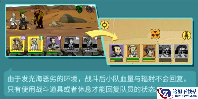 下面来给大家介绍下发光海区域的概况。由于发光海恶劣的环境,战斗后小队血量与辐射不会回复,只有使用战斗道具或者休息才能回复队员的状态。
