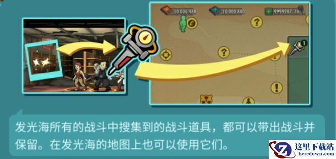 发光海所有的战斗中收集到的战斗道具,都可以带出战斗并保留。在发光海的地图上可以使用它们。