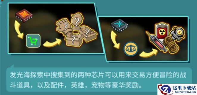 发光海探索中收集到的两种芯片可以用来交易方便冒险的战斗道具,以及配件,英雄等豪华奖励。