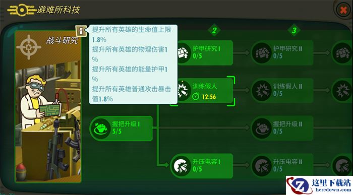 三、“科研室”,这个房间是“永久的buff”,一定要时时刻刻的对其进行关注,它可以进行生产、战斗方面的研究,确保监督者在城建以及英雄战斗上的收益可以最大化。
