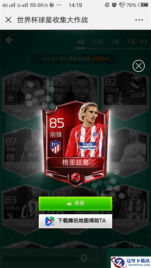 在收集大作战中,有一张卡的获取方式比较复杂,那就是格里兹曼。从网页腾讯地图上获取格里兹曼球员卡的难度非常大,想要轻松获取,你只需要下载一个“腾讯地图APP”即可。