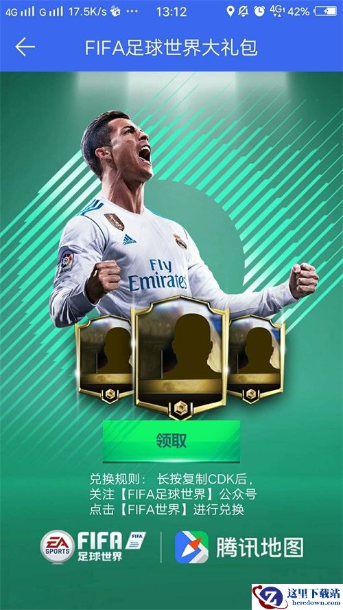 点进去之后我们会看到一个领取奖励的界面。点击“领取”后,系统会给我们一串CDKey,并要求我们关注《FIFA足球世界》公众号,然后去公众号中兑换。