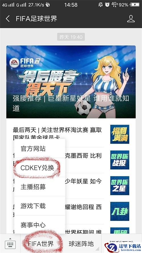 大家注意一下公众号中兑换CDkey的位置:“FIFA世界”-“CDKEY兑换”。