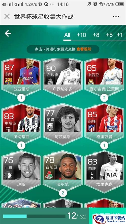 每名玩家每天只能获得15张球员卡,只有当你同一张球员卡有2张或者以上时,你才能将卡片赠送给其他人。如果你很幸运得在有效期限内集齐了本次活动全部的32张球员卡,那么你将有机会获得官方为你提供的世界杯决赛门票一张~