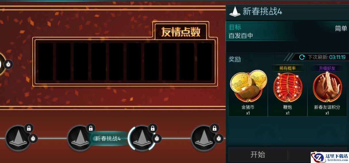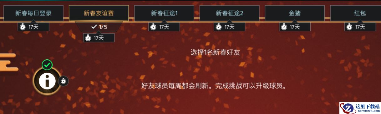 新春友谊赛章节,玩家可以从4位新春好友中选择1位开启挑战关卡,新春好友可以通过挑战关卡获得的友情点数升级,挑战关卡获取的征途门票可以在后面的征途章节使用,获取的对应积分可以在金猪和红包两个章节兑换相应奖励!