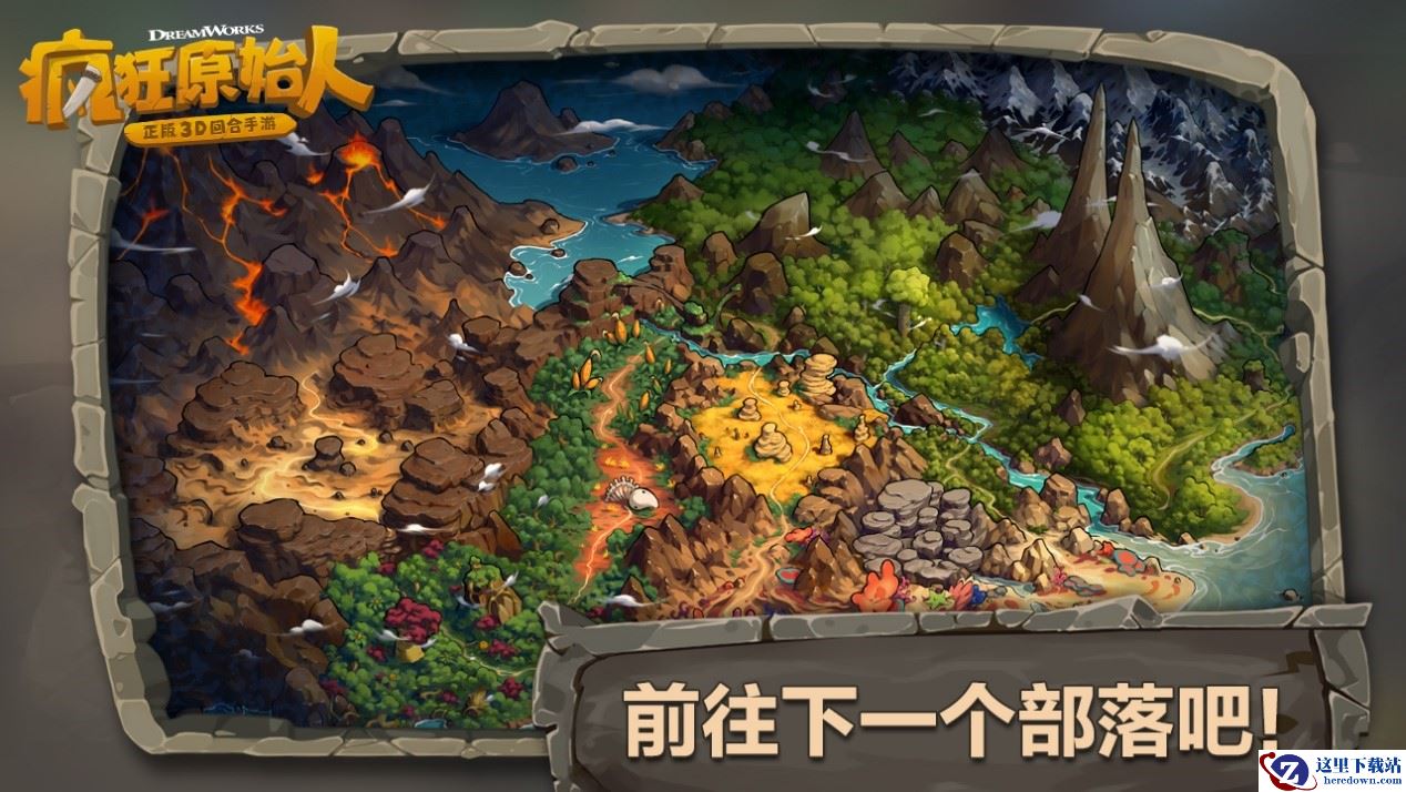 《疯狂原始人》游戏内沙漠、咕噜大峡谷位于最西边。西北有末日火山,熔浆四溢在大地上,随时有爆发的可能,生存环境十分恶劣。大雪山部落分布在原始大陆最东边,山峰高高的耸立着,终年被大雪覆盖。南边海洋环绕,居住着珊瑚部落的勇士们。森林中的水泽地里,象鼻鸟栖息在沼泽中,四周长满了参天大树,和动画中一样,四处散发着不安,挑战玩家们对未知的恐惧。
