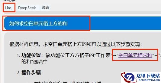 第二步:然后我们点击lke,输入我们需要求解的问题“如何求空白单元格上方的和”,可以看到AI快速的给了我们操作的步骤,我们可以点击颜色字体,就直接跳转到 方方格子 的空白单元格求和 的功能界面。我们直接进行操作即可。