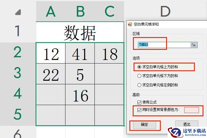 第三步:接着我们选择框选出要求空白单元格上方的和的区域范围位置A2:C5,根据自己需求设定选项,勾选 求空白单元格上方的和 ,再点击确定。