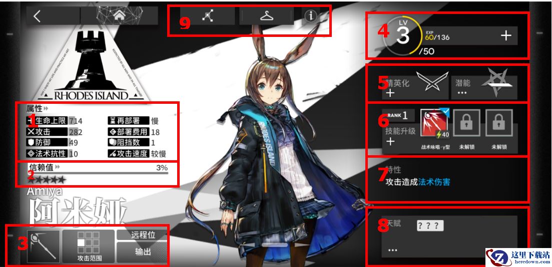 7.干员特性,某种意义上,同类型干员之间的最大区别就在这里。阿米娅的特性是攻击造成法术伤害,意味着她能狠狠打击敌方的高物理防御单位。此外,干员特性多种多样,和下面的干员天赋一起,让每一个干员都有自己的特点。