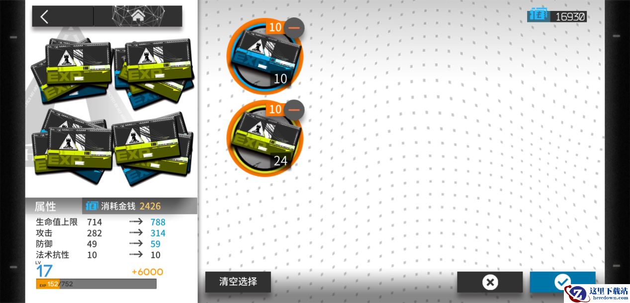 首先,是最最基础的干员等级提升啦!从上面说的干员等级区域可以进入提升界面,这里我们可以用收集到的干员经验卡和龙门币来提升干员等级。如图所示,一次消耗的经验卡上限是20张,界面中也很清楚地标示出这次等级提升会给干员带来的变化——生命值,攻击和防御都会提升。