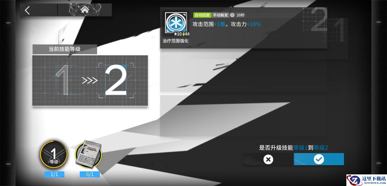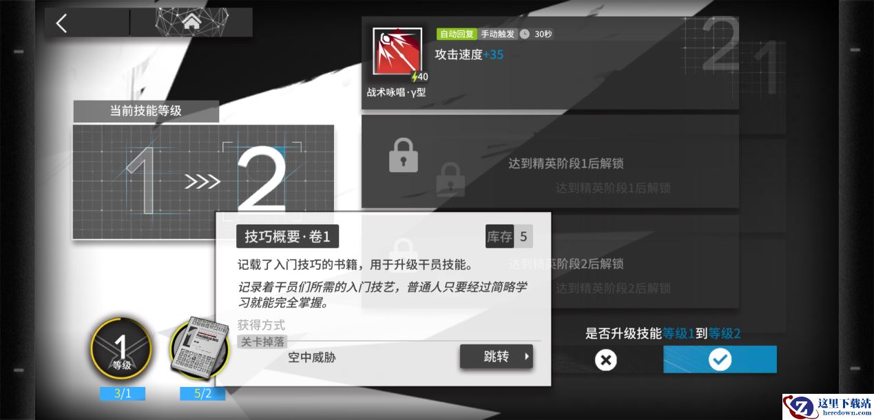 同样的,在干员面板中的技能区域,可以进入技能选择界面,在选定技能之后点击左边方框数字下的箭头就可以进入技能升级界面。左下角显示了提升技能所需要达到的干员等级和消耗的素材。明日方舟十分人性化的一点在于,很多地方点击素材可以直接得知该素材的获取方式。