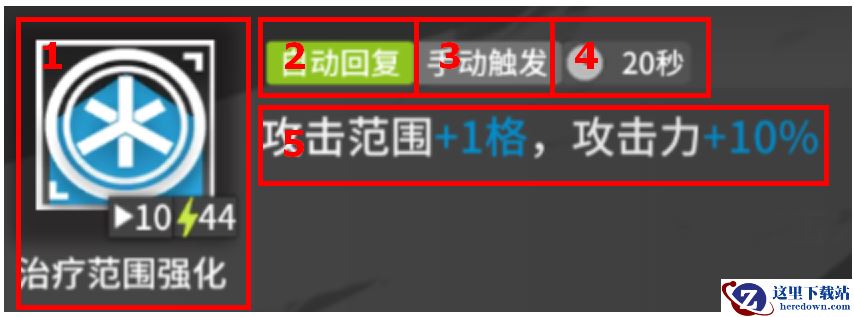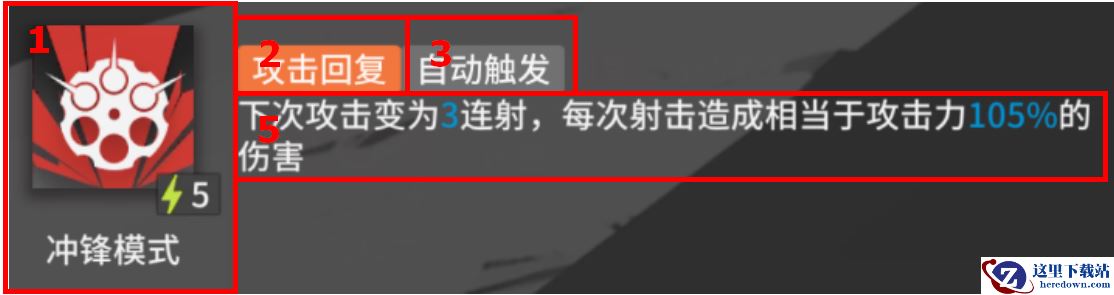 1:技能图标、名字和所需能量:图标和名字不用多说。图标的右下角闪电符号后的数字表示开启技能所需要的能量多少,一般而言分为两种,自动回复型技能这里的数值表示需要的能量数量,而攻击回复型技能这里的数值表示开启技能需要的攻击次数。而前面那个三角形好像视频开始按钮一样的图标,其后面的数值表示干员的初始能量——一般而言,干员部署下去时能量为0,而拥有这一特性的技能会让干员在部署的时候就有一定数量的初始能量,很明显,这代表该干员能在战斗中更快释放出第一次技能。