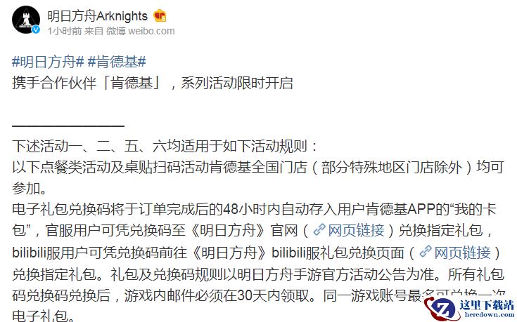 电子礼包兑换码将于订单完成后的48小时内自动存入用户肯德基APP的“我的卡包”,官服用户可凭兑换码至《明日方舟》官网兑换指定礼包,bilibili服用户可凭兑换码前往《明日方舟》bilibili服礼包兑换页面兑换指定礼包。礼包及兑换码规则以明日方舟手游官方活动公告为准。所有礼包码兑换码兑换后,游戏内邮件必须在30天内领取。同一游戏账号最多可兑换一次电子礼包。