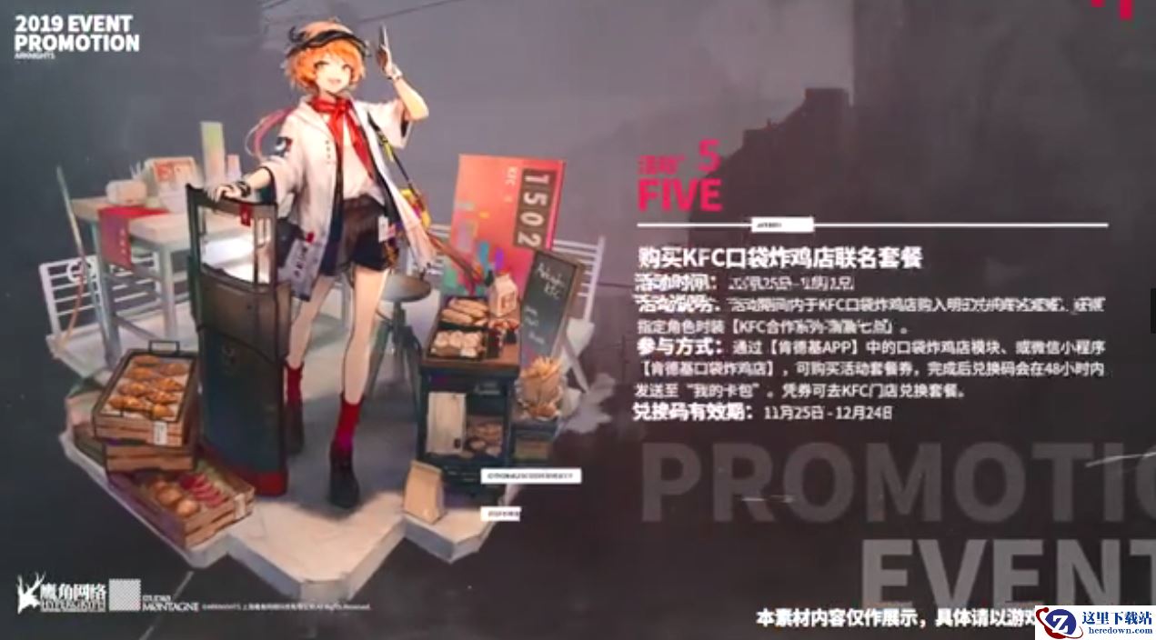 活动说明:活动期间内于KFC口袋炸鸡店购入明日方舟联名套餐,获得指定角色时装【KFC合作系列-清晨七点】。