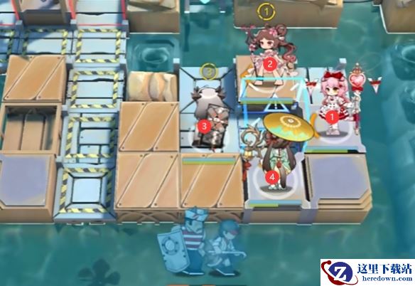 如图所示部署澄闪、艾雅法拉(向左),塞雷亚提供阻挡,最后部署蜜莓提供治疗。