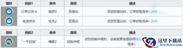 精二35%的订单加成,和能天使效率相当,在贸易站干员中暂列第二档位,精零20%加成还不如隔壁那些三四星干员