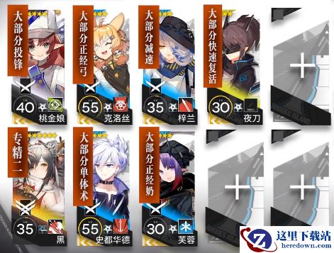 其他干员:执旗手先锋、常规狙击、单体术师、减速辅助、快速复活、单奶