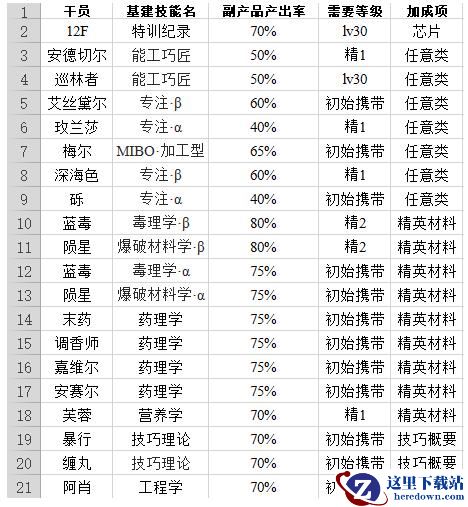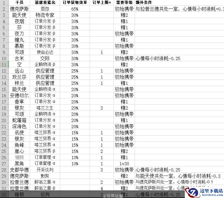明日方舟基建干员技能按照不同部门,基建技能也有很大不同,比如控制中区主要技能为合作协议、左膀右臂、swweep;贸易站:订单分发、供应管理、谈判、物流专家等。